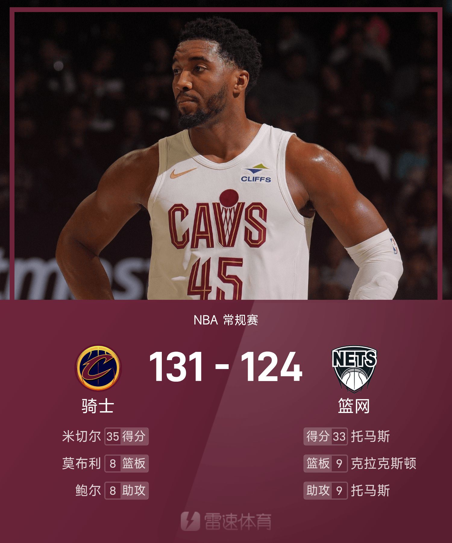 รายงาน NBA: มิทเชลล์ 35 แต้ม คาวาเลียร์ส เอาชนะ เน็ตส์ 131-124