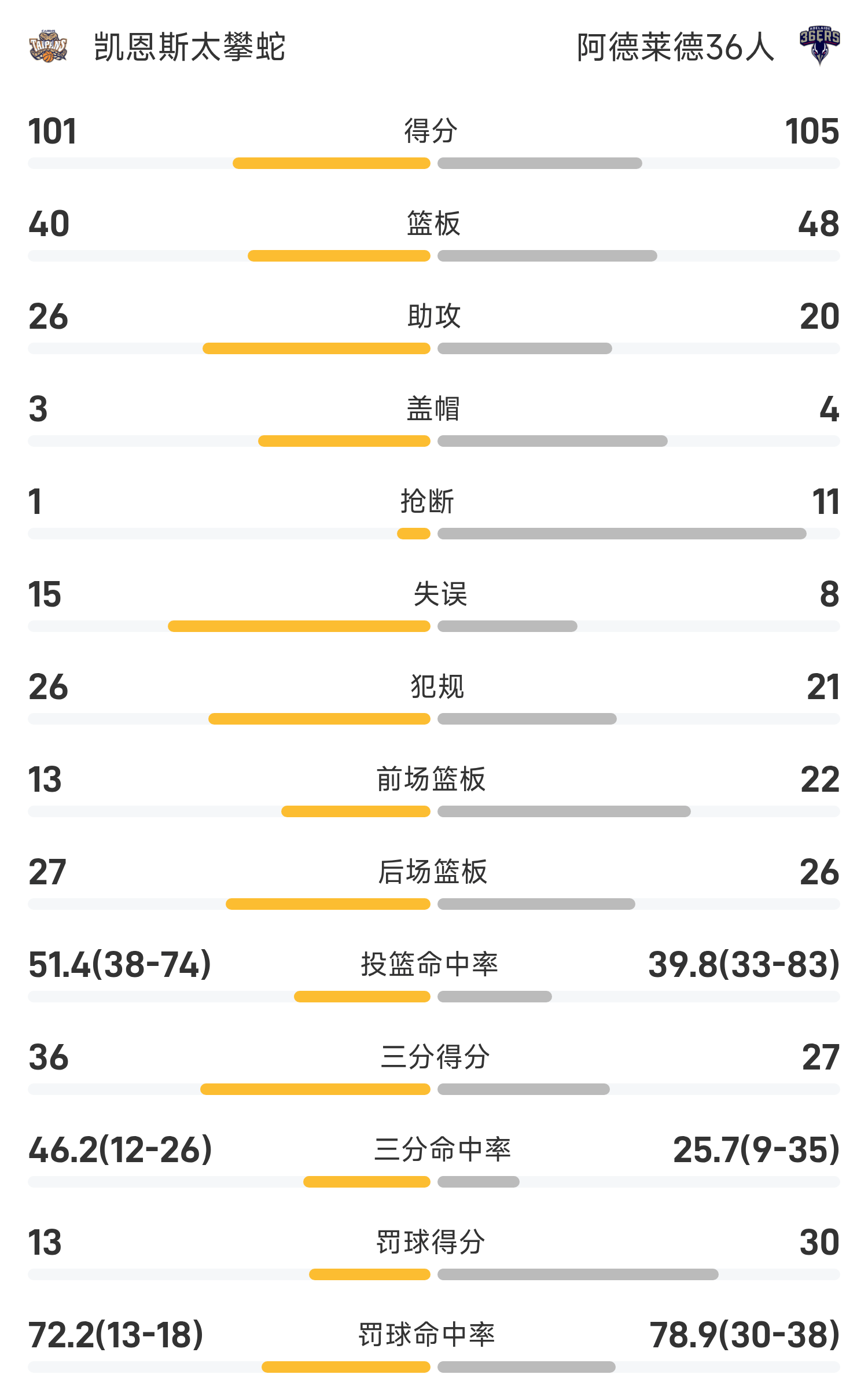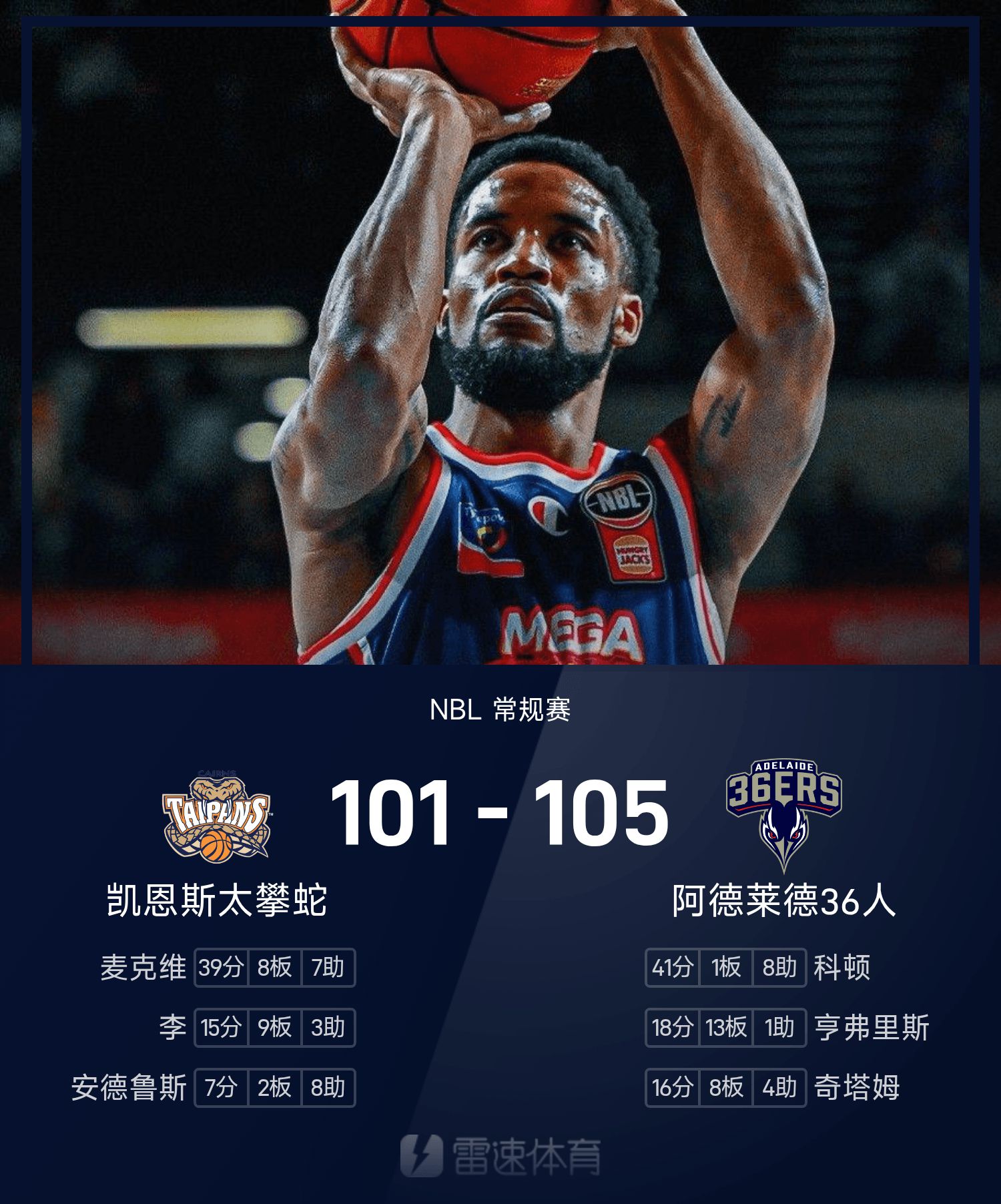 ในตอนท้ายของเกม ผู้เล่น 36 คนของแอดิเลดเอาชนะแคร์นส์ ไทปัน สเนคส์ 105-101