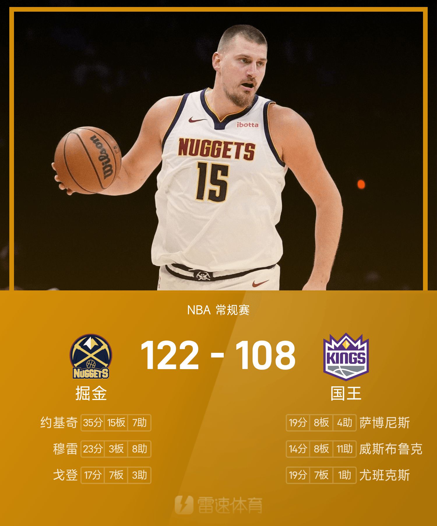 โยคิช 35 แต้ม 15 รีบาวด์ และ 7 แอสซิสต์ เวสต์บรูคทำประตูแบบกึ่งทริปเปิลดับเบิลโดยไม่เกิดประโยชน์ และนักเก็ตก็เอาชนะคิงส์ได้อย่างง่ายดาย