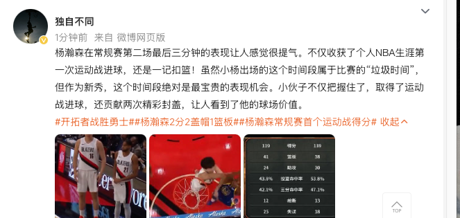 ผลงานของ Yang Hansen ในช่วงสามนาทีสุดท้ายของเกมที่สองของฤดูกาลปกติเป็นกำลังใจอย่างมาก เขาไม่เพียงแต่ทำประตูในเกมกีฬาเป็นครั้งแรกในอาชีพ NBA เท่านั้น แต่ยังเป็นสแลมดังก์อีกด้วย! แม้ว่าช่วงเวลาที่เซียวหยางปรากฏตัวจะเป็น "เวลาขยะ" ของการแข่งขัน แต่ในฐานะผู้เล่นใหม่ ช่วงเวลานี้เป็นโอกาสในการแสดงที่มีค่าที่สุดอย่างแน่นอน ชายหนุ่มไม่เพียงแต่คว้ามันและยิงประตูในเกมกีฬาเท่านั้น แต่ยังมีส่วนช่วยสองช่วงตึกที่ยอดเยี่ยมซึ่งแสดงให้เห็นถึงคุณค่าของเขาในเกม