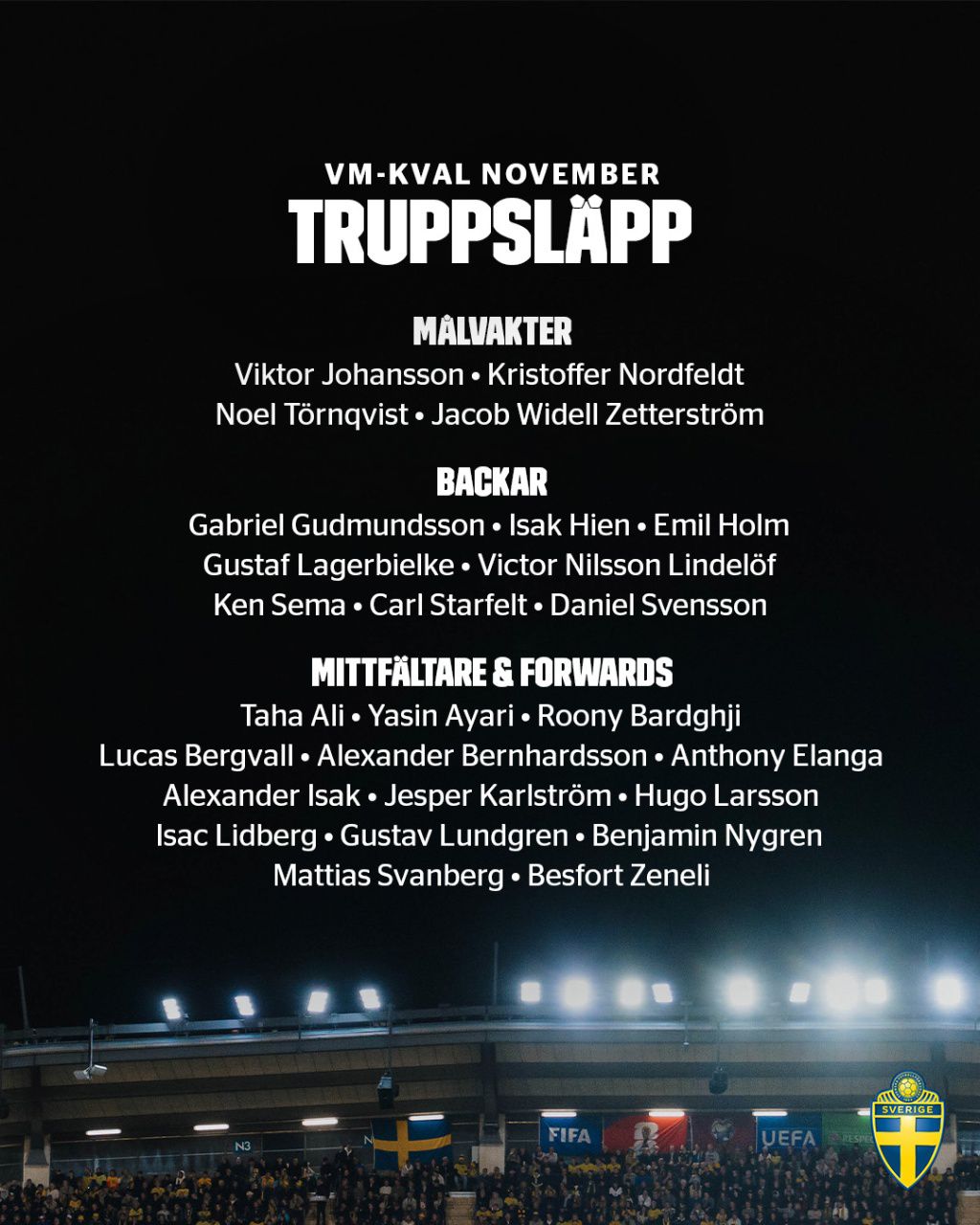 รายชื่อทีมชาติสวีเดน: ไอแซคขึ้นนำ, เจเคไรส์บาดเจ็บ