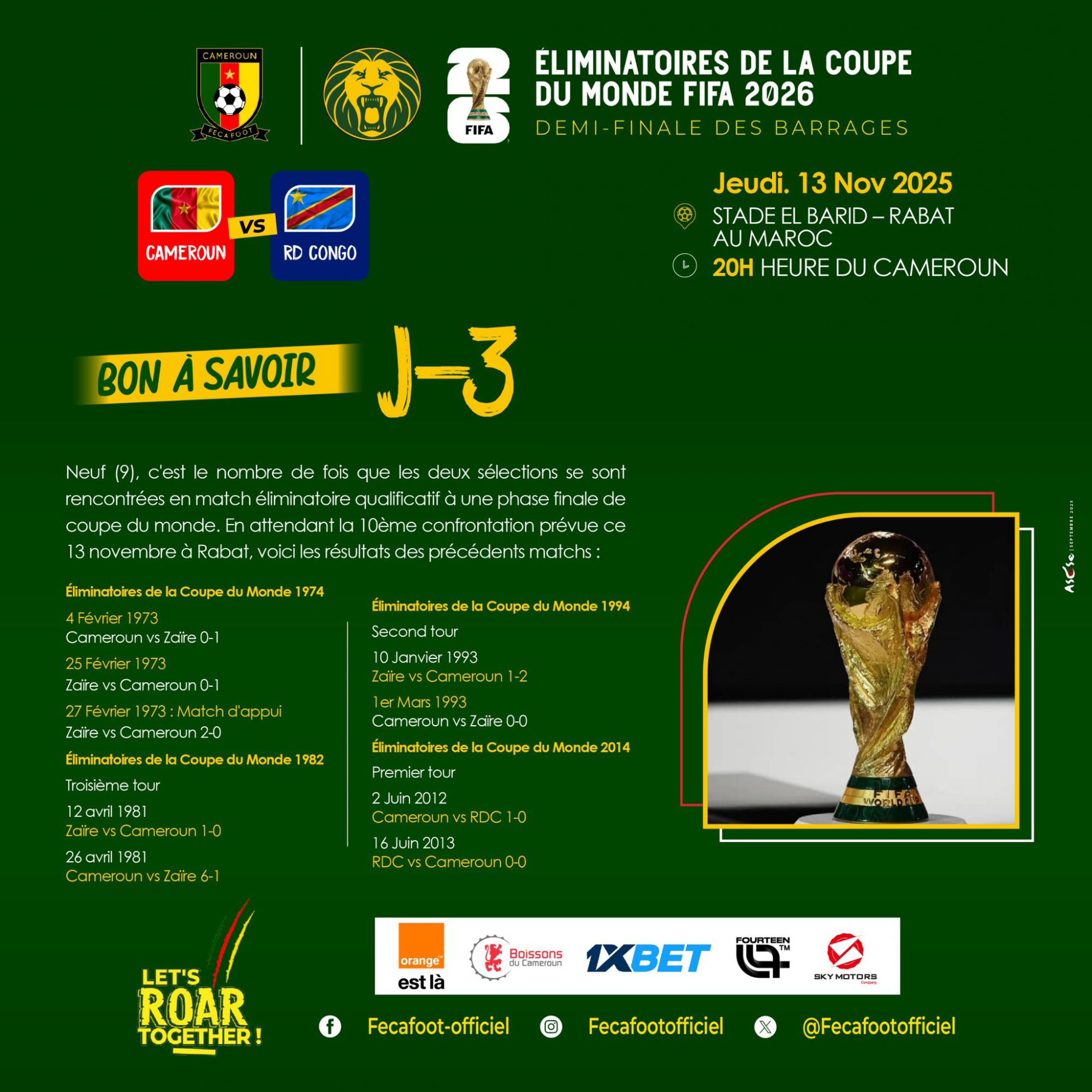เวลา 03.00 น. ของวันที่ 14 พฤศจิกายน ตามเวลาปักกิ่ง ในการแข่งขันเพลย์ออฟรอบคัดเลือกแอฟริกาของการแข่งขันฟุตบอลโลกรอบคัดเลือกสหรัฐ-เม็กซิโก ปี 2026 แคเมอรูนและสาธารณรัฐประชาธิปไตยคองโกจะแข่งขันกันที่สนาม Albari Derby Stadium ในโมร็อกโก ผู้ชนะของเกมนี้จะแข่งขันกับผู้ชนะในเกมอื่นระหว่างกาบองและไนจีเรีย เพื่อรับตั๋วเพลย์ออฟข้ามทวีปเพียงใบเดียวในแอฟริกา