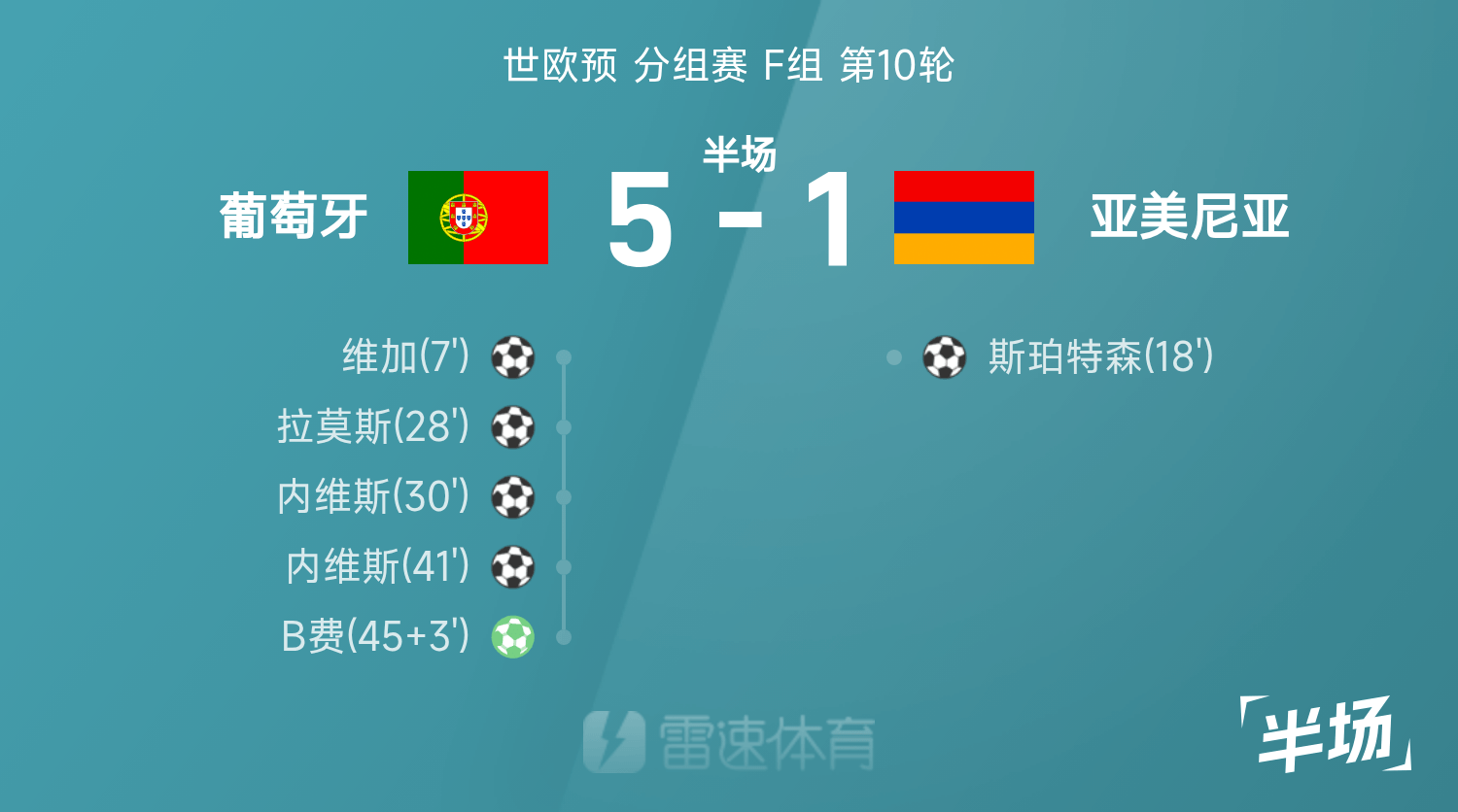 ครึ่งเวลาแรกโลกยุโรป: เนเวสยิงสองครั้ง, ยิงค่าธรรมเนียม B, โปรตุเกส 5-1 อาร์เมเนีย