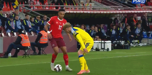 รายชื่อผู้เล่นตัวจริงของสวิตเซอร์แลนด์: 1-Kerber, 13-Rodríguez, 3-Widmer, 4-Elvedi, 5-Akanji, 10-Xhaka, 20-Abicher, 17-Vargas, 22-Reid Er, 11-Ndoye, 7-Embolo