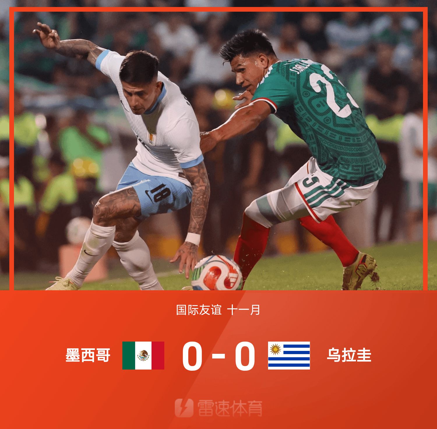 6686 ข่าวกีฬาเมื่อวันที่ 16 พฤศจิกายน ในการแข่งขันกระชับมิตรระหว่างประเทศ ทีมเม็กซิโกเสมอกับอุรุกวัย 0-0 ในครึ่งแรกไม่มีทีมใดทำผลงานได้สำเร็จ ในครึ่งหลัง ตอร์เรส และโมรา ต่างก็พลาดโอกาสดีๆ กัน และทั้งสองทีมก็เสมอกันแบบไร้สกอร์ 0-0 ในเกมกระชับมิตรนัดถัดไป เม็กซิโก เผชิญหน้า ปารากวัย และ สหรัฐอเมริกา
