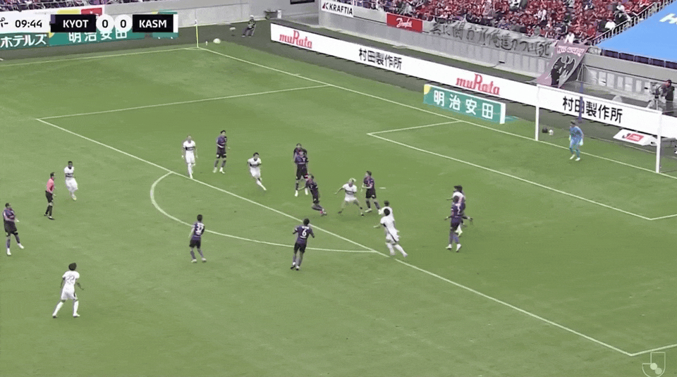 9’ กลิ่นดินปืนเริ่มแรงขึ้น! โอกาสโจมตีจากลูกตั้งเตะของคาชิมะ ผู้เล่นจากทั้งสองฝ่ายผลักกันจนสุดโค้ง